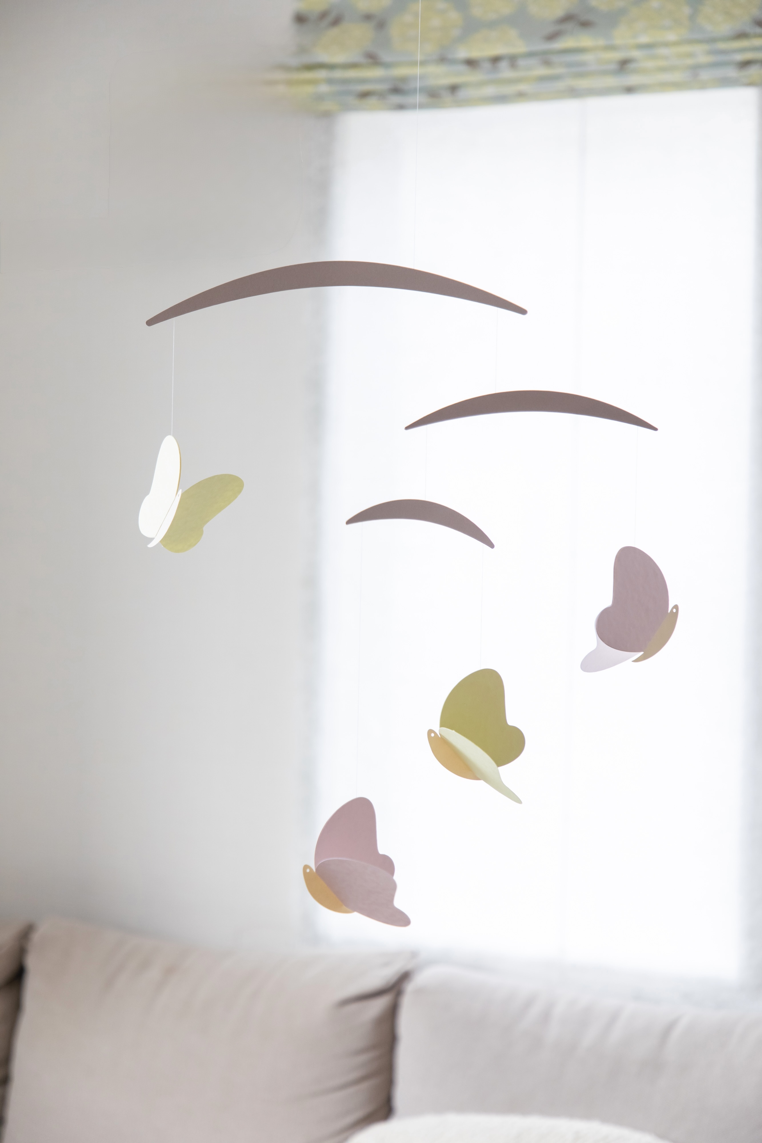 4羽の蝶が優雅に舞うエレガントなモビールです。丁寧な作りはそのままに、インテリアとしても飾れるようにデザイン性をアップしたSTANDARDシリーズ。