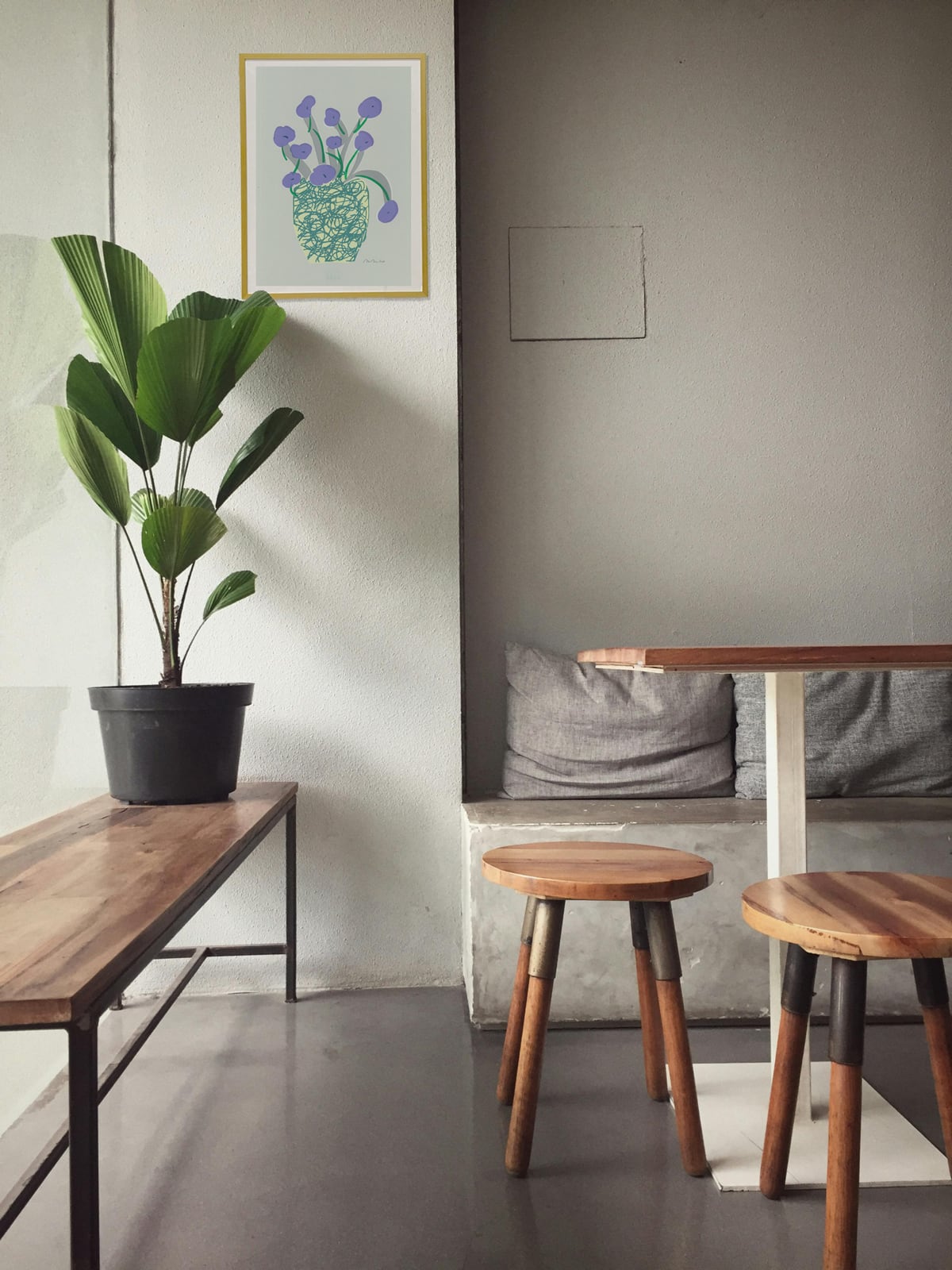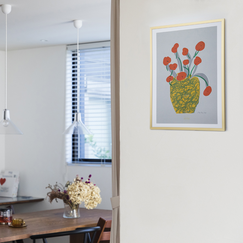 ポスターの大きさはB4サイズ(257mm×364mm)。額に入れて飾っていただくと、お部屋を一気に華やかにしてくれますよ。メタリックな額にも、木製の額にも、どちらの雰囲気にもピッタリとフィットします。本物のお花と並べて飾ってみても、素敵ですよ。